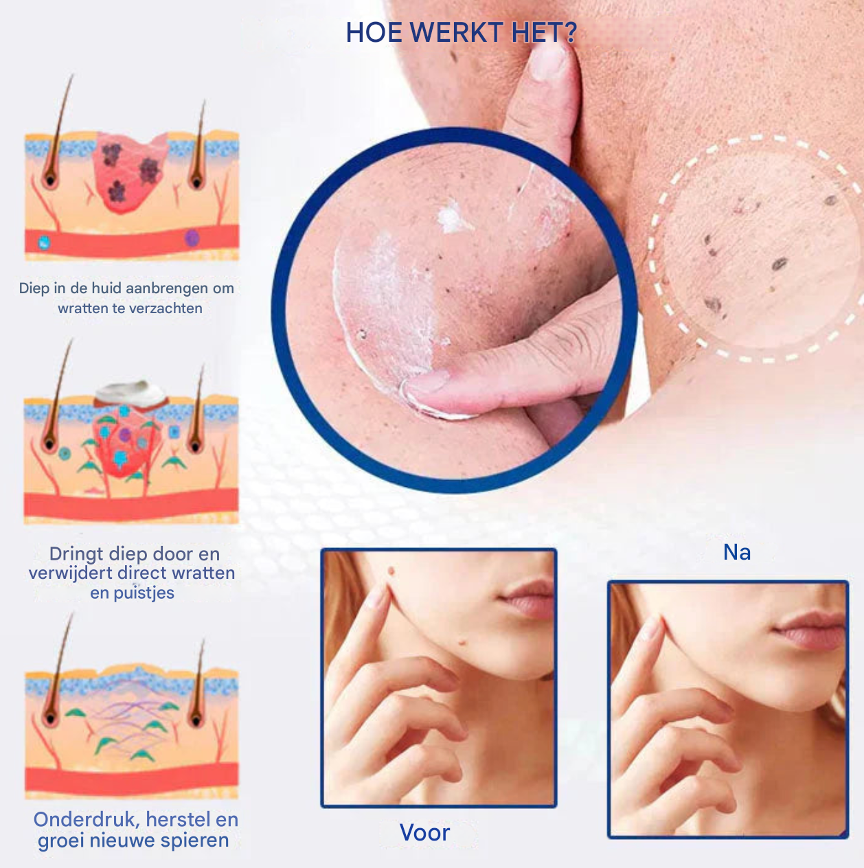 De zalf dringt diep door tot in de kern van de wrat, lost keratine op en zorgt dat de wrat na enkele toepassingen vanzelf afvalt. Tegelijk voorkomt het dat wratten opnieuw verschijnen. En het mooiste? Het laat géén littekens of pigmentvlekken achter – ideaal voor gebruik op gezicht, nek, handen en andere gevoelige plekken.