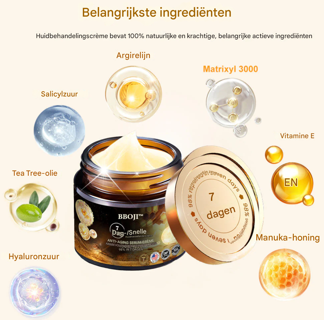 ✔️ Onze LS 7-Daagse Snelle Huidherstelcrème Gebruik deze innovatieve crème dagelijks voor een merkbare verbetering van je huidconditie. Of je nu last hebt van acne-littekens, ouderdomsvlekken of huidverslapping, BBOJI™ 7-Daagse Snelle Huidherstelcrème biedt een alles-in-één oplossing voor een gezonde en verjongde huid.