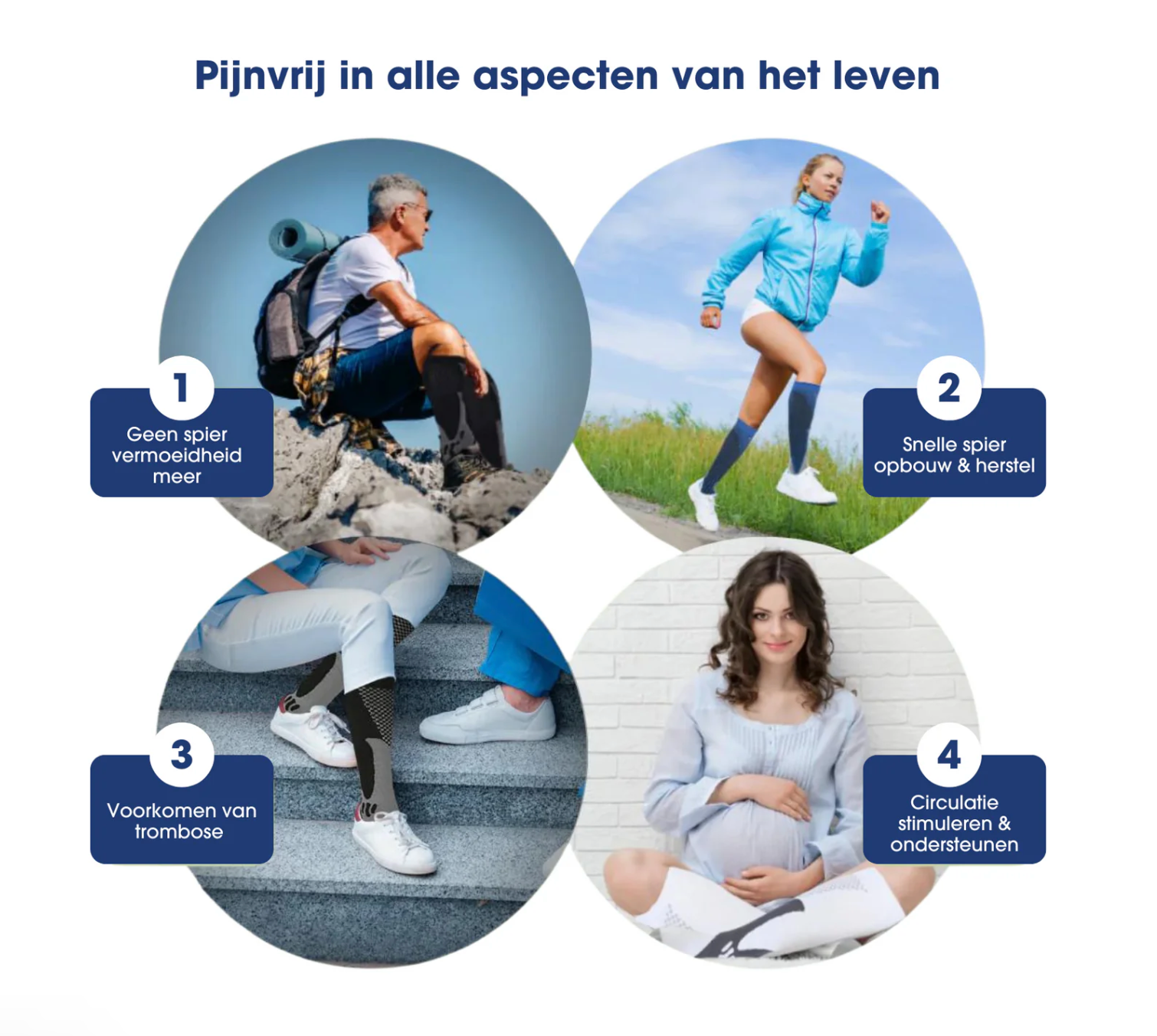 gerichte druk om pijn te verlichten en je benen te ondersteunen, zodat jij weer moeiteloos kunt bewegen.