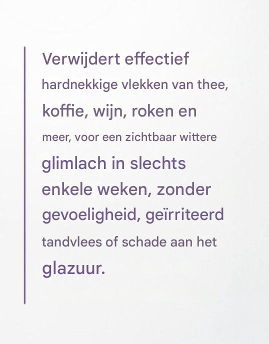 Of je nu last hebt van koffievlekken, theeaanslag, wijnresten of rookplekken – deze poeder pakt ze stuk voor stuk aan. Voor een frisse, egale en stralende lach, elke dag opnieuw.
